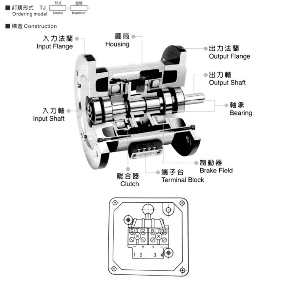 臺灣天機傳動雙法蘭電磁離合剎車器電機組合由TJ-POH立式雙法蘭電磁離合剎車組與三相電動機組合,適用性強,安裝簡單方便