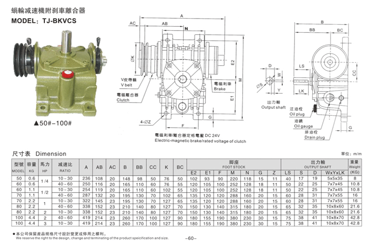 電磁離合剎車減速機(jī)適合匹配規(guī)格2.5KG、5KG、10KG的電磁離合器與制動(dòng)器,而減速機(jī)傳動(dòng)比則有10、20、30、40、50、60共6個(gè),減速機(jī)中心距有50、60、70、80、100共5個(gè)(型號(hào))。安裝尺寸規(guī)格如下: