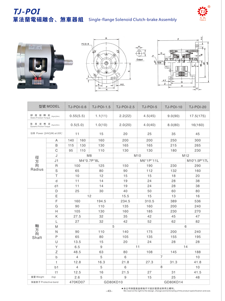 臺灣天機(jī)傳動單法蘭電磁離合器制動器組合(TJ-POI型)法蘭輸入,方便簡單,安裝方式有立式安裝及臥式安裝,被廣泛應(yīng)用于起動、定位、寸動、停止、高頻運(yùn)轉(zhuǎn)、過載保護(hù)等多種用途。本機(jī)型適與電動機(jī)直接連結(jié),法蘭面配合IEC國際規(guī)格,安裝快速,不占用空間。
